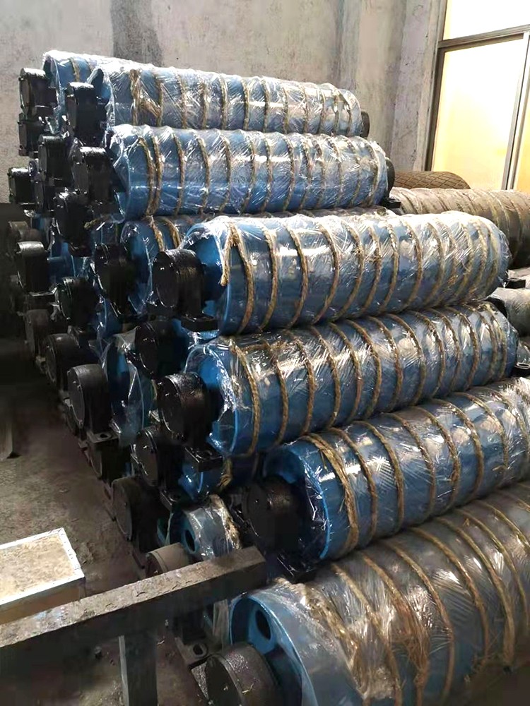 尾部滾筒組件由轉軸、套于轉軸上并由輸送帶繞卷的齒形液筒體、位于轉軸兩端并可隨轉軸轉動把堆積物料返帶回輸送帶上的扇形回料器。該具有尾部滾筒的全密封帶式輸送機結構簡單,能在不停機的情況下能自動對堆積在尾部的物料進行清理并帶回至輸送帶上,采用與輸送帶配合轉動的尾部滾筒組件結構,通過尾部滾筒的扇形回料器的扇形葉片把堆積物料帶回至輸送帶上,實現不停機的堆積物料清理,具有結構簡單,工作穩定性高和精度高,連續性強,工作效率高,工作壽命長等優點。